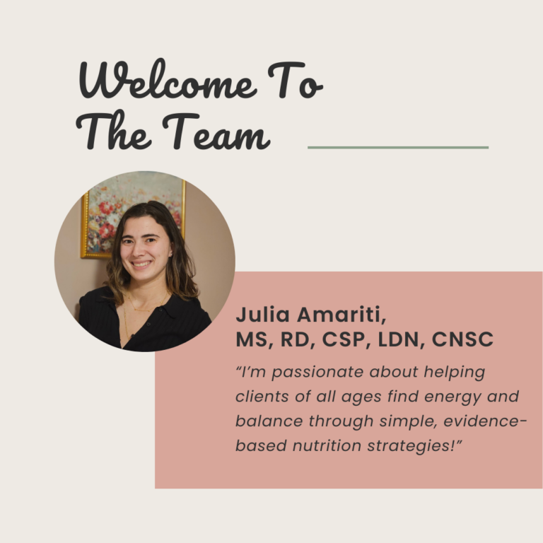 We have exciting news to share! Our practice is growing, and we are thrilled to welcome Julia Amariti, our third dietitian, to the Time To Thrive Nutrition team. Julia is a board-certified Nutrition Support Dietitian and Pediatric Dietitian with expertise in gastrointestinal diseases, pediatric nutrition, and women’s health. Born and raised in South Jersey, Julia now lives there with her husband and their dog, Lady. In her free time, she enjoys reading, taking long walks with Lady, and spending quality time with family and friends. We are so excited to have Julia on board and can’t wait for you to meet her! If you’re interested in working with Julia or have any questions, feel free to reach out to us.