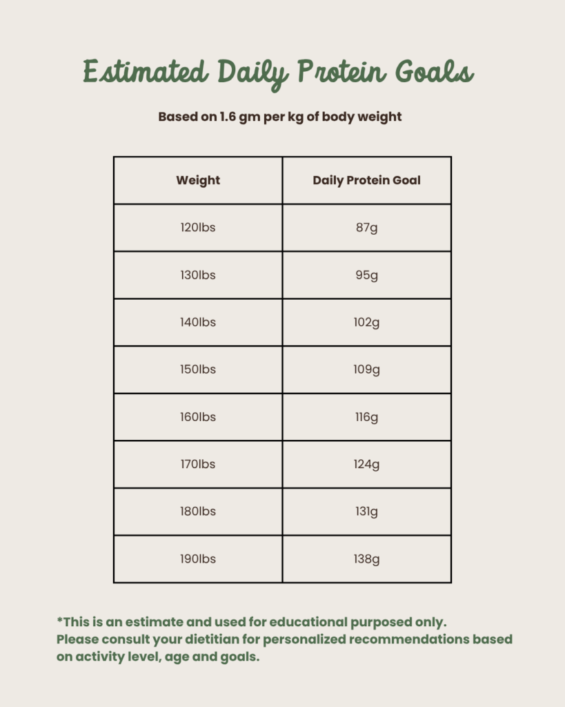 For most women over 35, a better target is ~1.6 grams of protein per kilogram of body weight goal. To calculate kilograms, divide your weight by 2.2. Most women need between 100-130 grams of protein, or about 25–35 grams per meal, with a 20 gram protein snack)